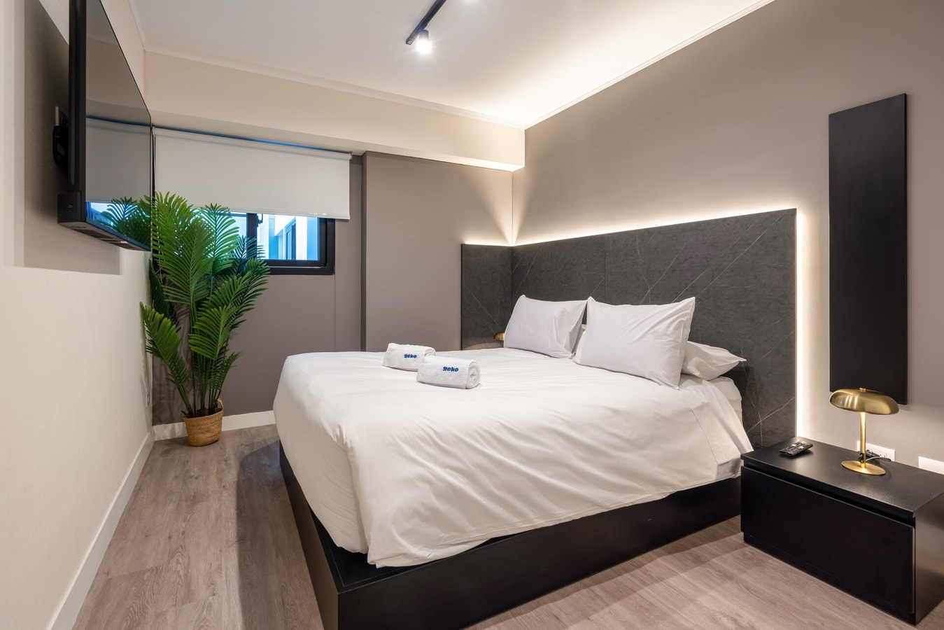 - Dormitorio equipado con una cómoda cama queen, smart TV y cortinas blackout.