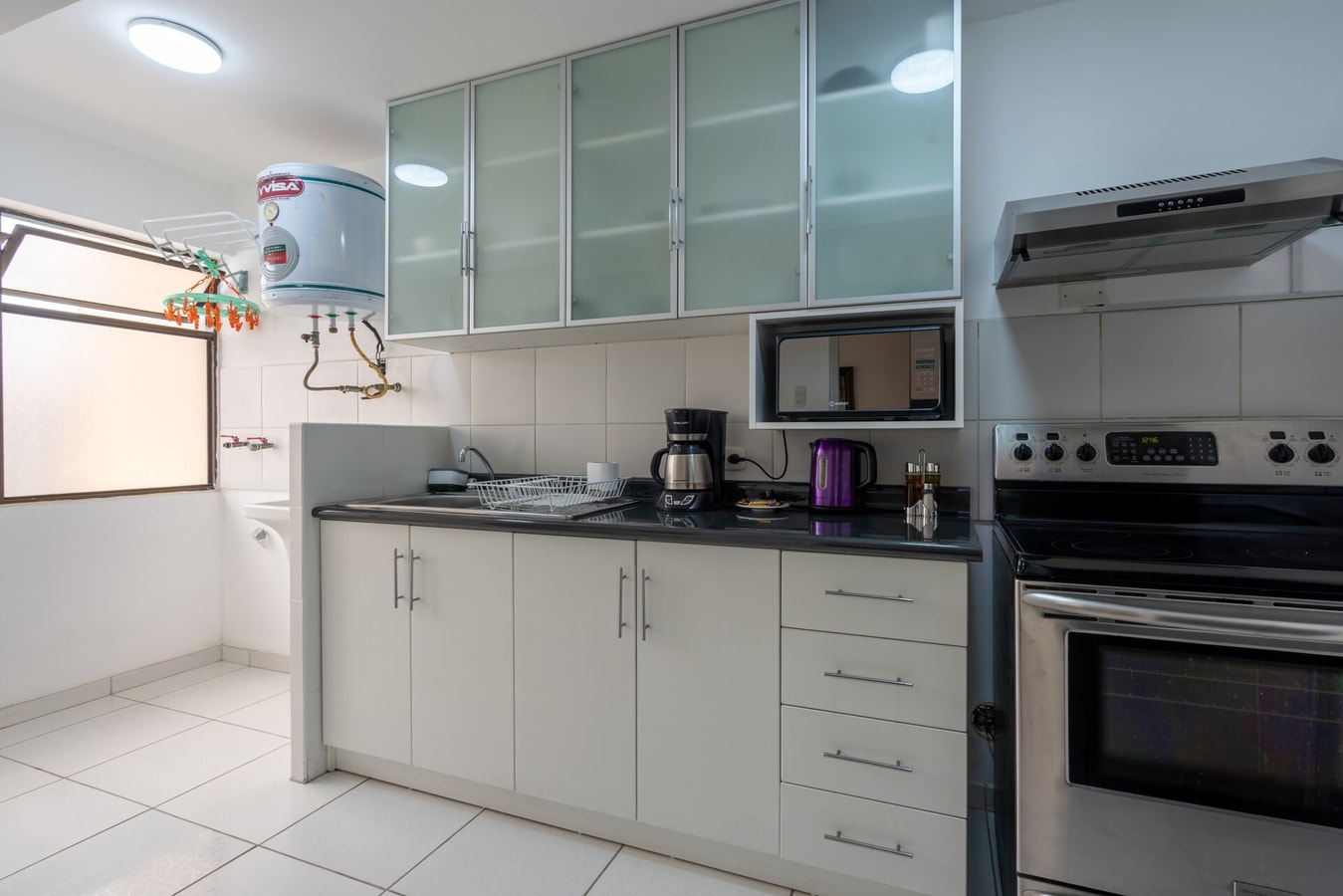 La cocina, está equipada con microondas, vajilla/cubertería, utensilios/cocina, cafetera y hervidor de agua.