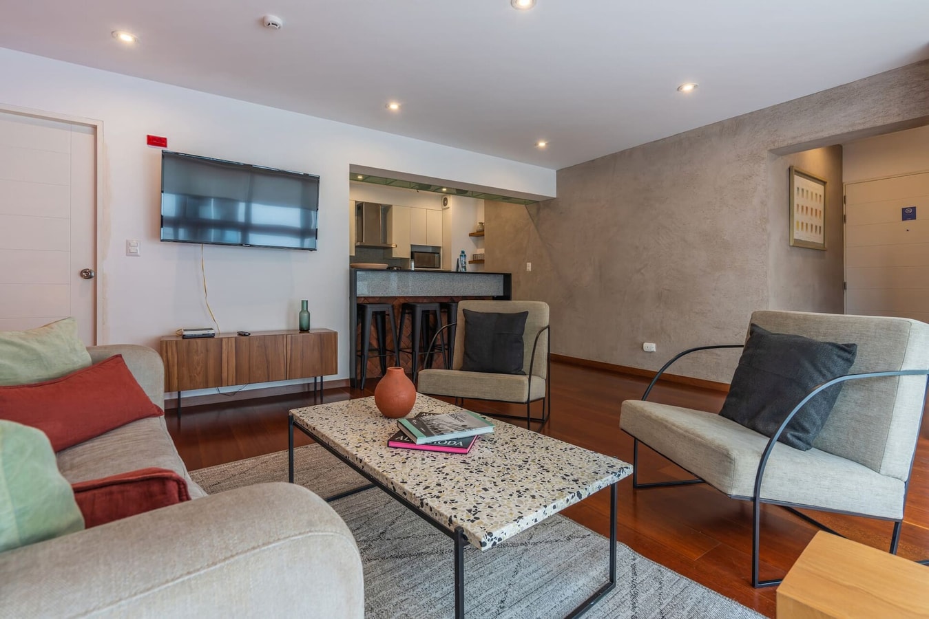Te damos la bienvenida a Mezcal by geko. Disfruta de la experiencia de hospedarte en el corazón de Miraflores, a pasos del Parque Kennedy, rodeado de los mejores restaurantes, bares y cafés de la ciudad. Este departamento ofrece un ambiente moderno, bien distribuido y diseñado para tu comodidad y descanso. Su ubicación privilegiada permite recorrer a pie uno de los distritos más vibrantes de Lima.
