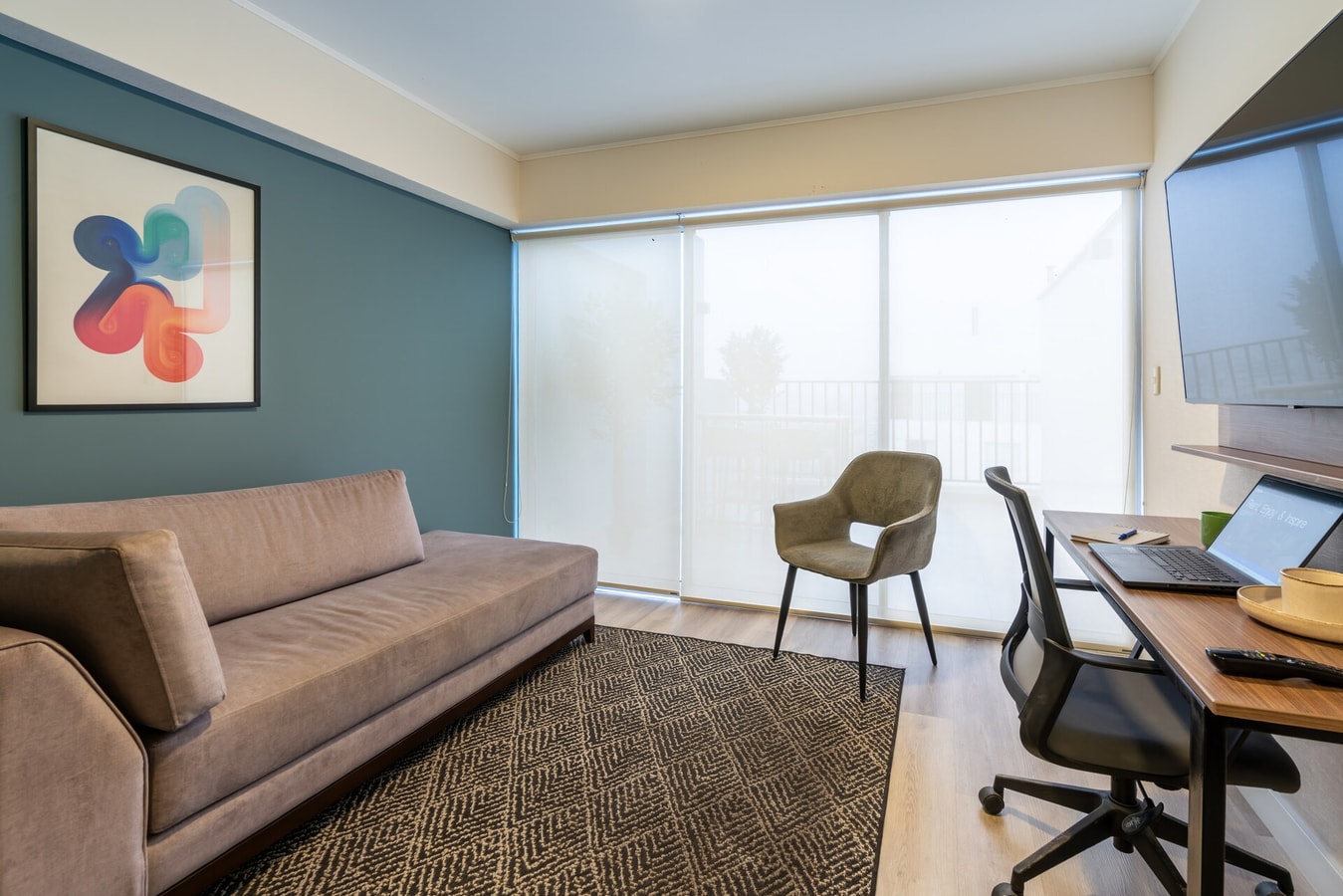 Living/Dining Area: Bright space featuring a cozy sofa and a dining table for two. Modern decor and carefully selected details create a warm and elegant ambiance.​
