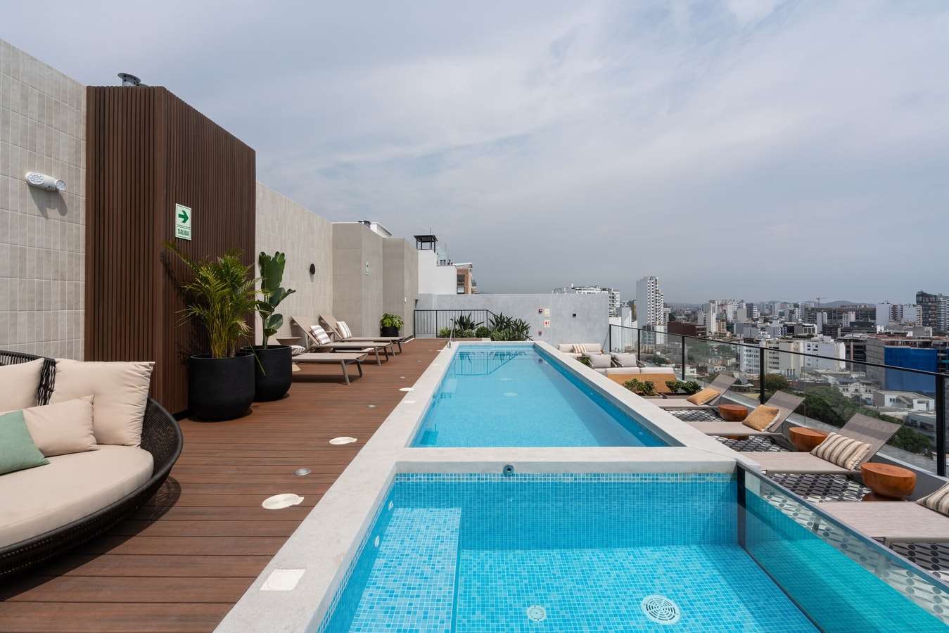 - Acceso a las áreas comunes del edificio: piscina en el rooftop; además de un área de coworking, servicio de lavandería y un gimnasio.