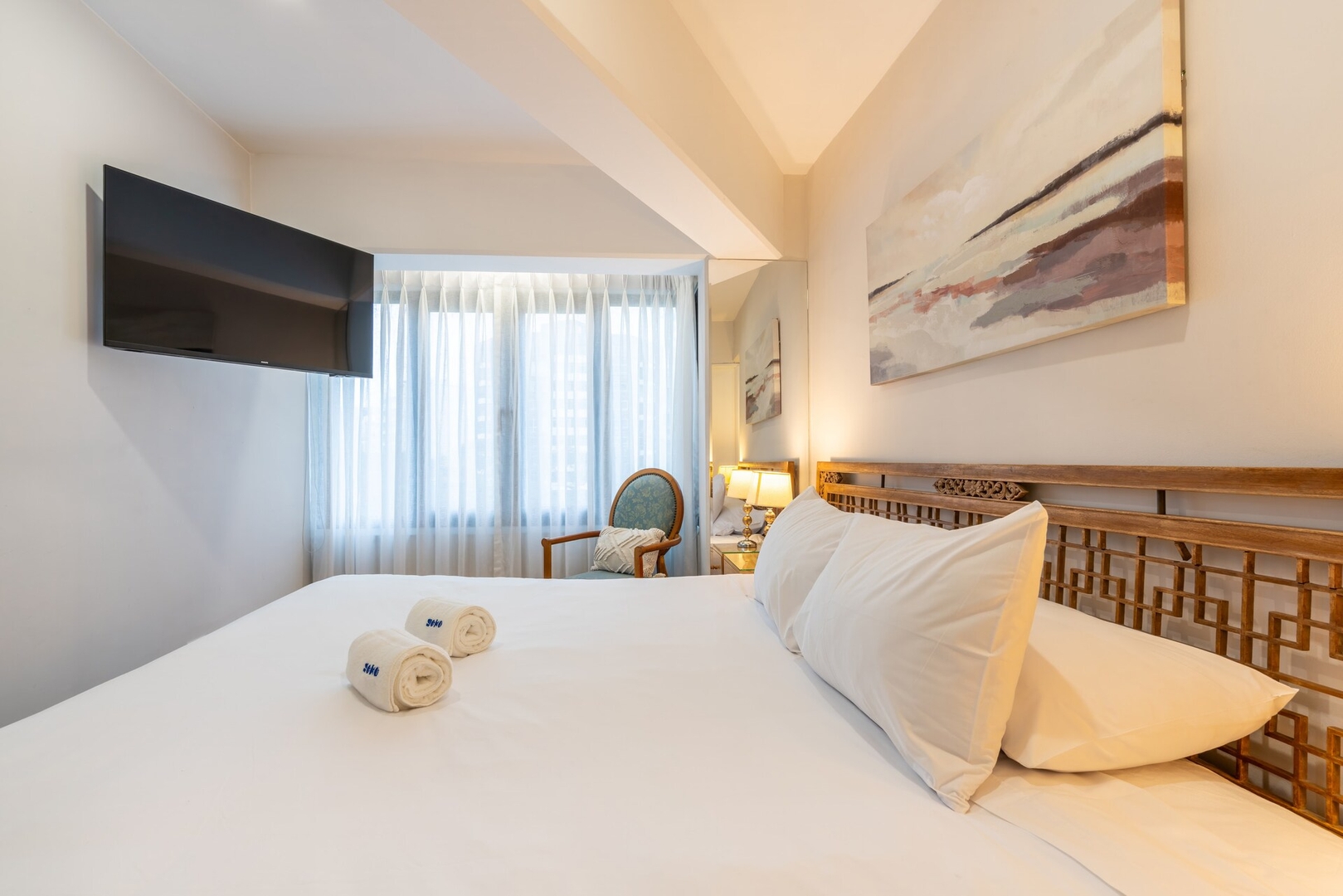 Dormitorio: Equipado con una cómoda cama queen size, sábanas de alta calidad y un amplio armario. Las cortinas blackout aseguran un descanso reparador.