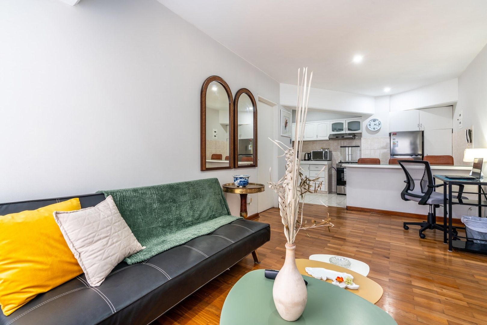 Sala / Comedor: Espacio luminoso con un sofá acogedor. La decoración moderna y los detalles cuidadosamente seleccionados crean un ambiente cálido y elegante.